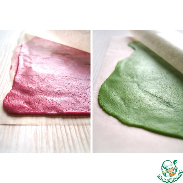 Тесто каждого вида раскатать скалкой между двумя кусками пищевой бумаги или плёнки. Толщина пласта около 2 мм. Прямо в бумаге убрать тесто в холодильник до того момента, как оно потребуется.