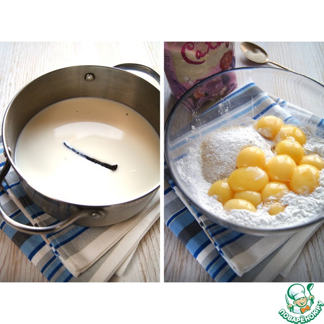 Для этого в кастрюлю налить 750 г. молока, стручок ванили надрезать, вытащить семена, то и другое поместить в кастрюлю с молоком. За неимением ванили в стручках её можно заменить на пакетик ванильного сахара или на кристаллический ванилин, буквально на кончике ножа.