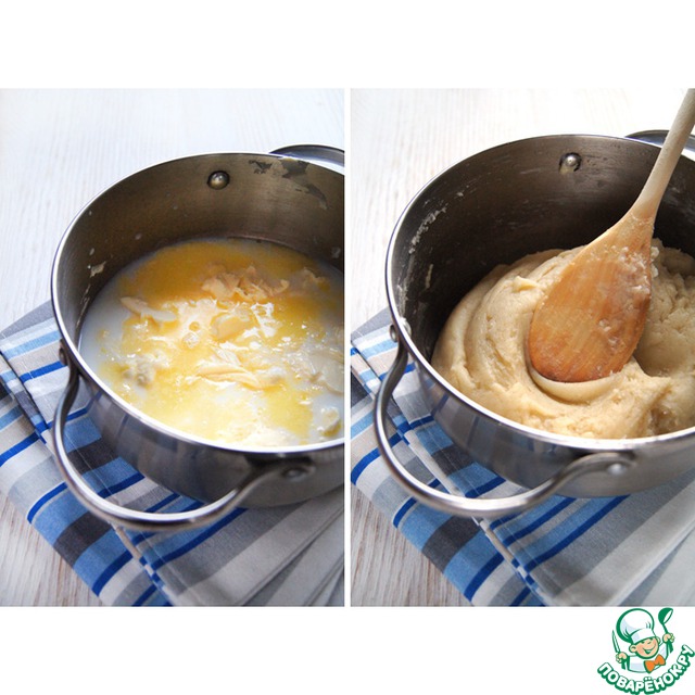 Снять кастрюлю с огня и в один приём добавить 200 г. просеянной муки. Перемешать хорошенько. Нужно, чтобы мука вобрала всю жидкость. После этого кастрюлю вернуть на огонь и постоянно помешивая, подсушить тесто. Пары минут для этого бывает достаточно. В результате такой манипуляции тесто приобретает гладкость и пластичность.