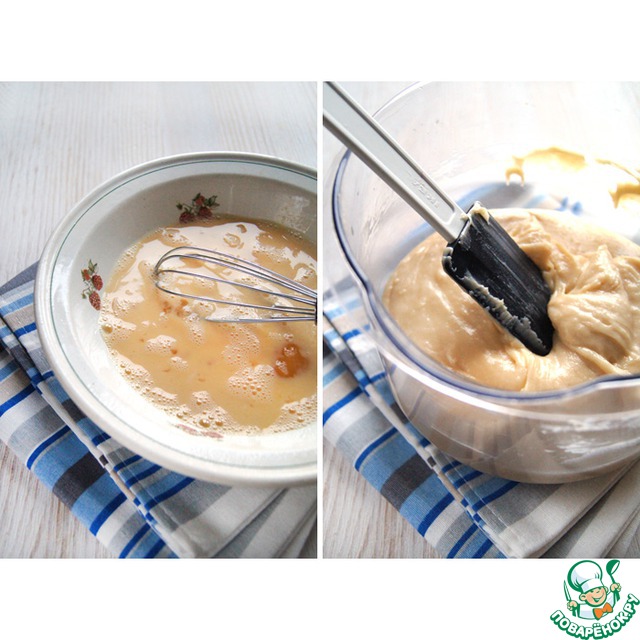 Постепенно прибавляя яичную смесь, начать взбивать миксером тесто. Рекомендуемой для этих целей насадки "лист/весло" у меня не имеется, поэтому я пользовалась обычной насадкой миксера, в окончании перемешала лопаткой до сообщения тесту гладкости, глянцевитости.
