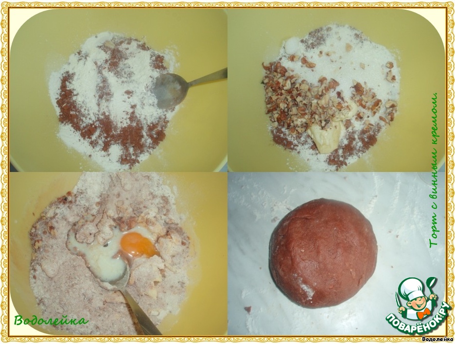 Дальше добавляем размягченное масло (можно маргарин), сахар, орехи (орехи любые, у меня грецкие), желток, молоко. Все это замесить в однородное тесто (при надобности добавить немного муки). Тесто получается мягкое. Сформировать из теста шар, накрыть пленкой и поставить в холодильник на 1 час.