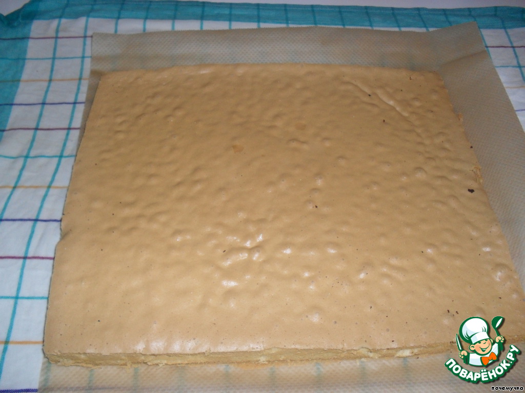 Аккуратно ввела белки в желтковую массу, осторожно перемешала. Выложила тесто в прямоугольную форму (аналогичного размера) на вощеную бумагу.