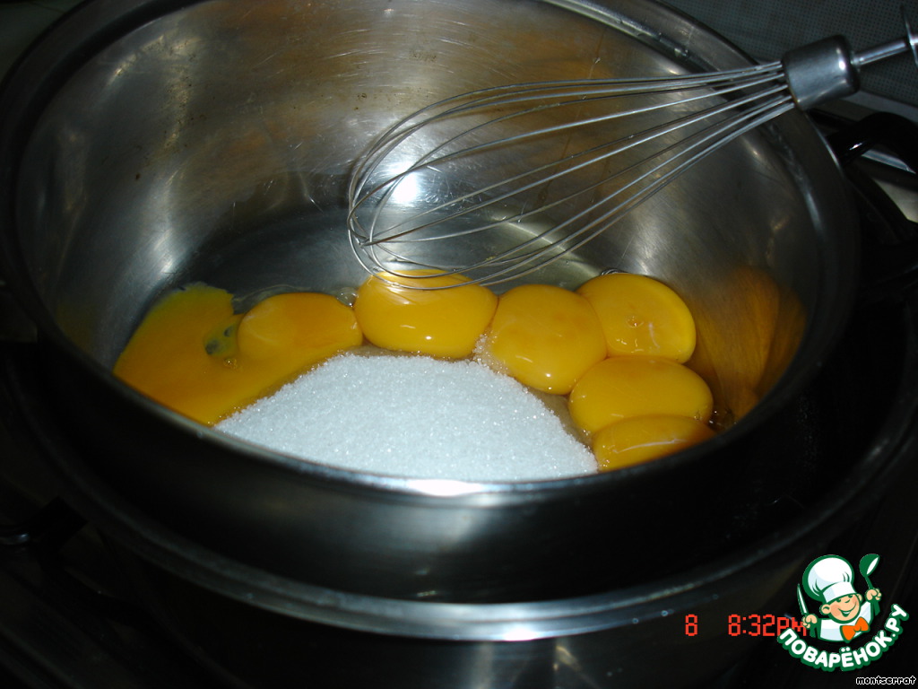 и взбиваем с сахаром на водяной бане с добавлением ванили и вина до загустения.