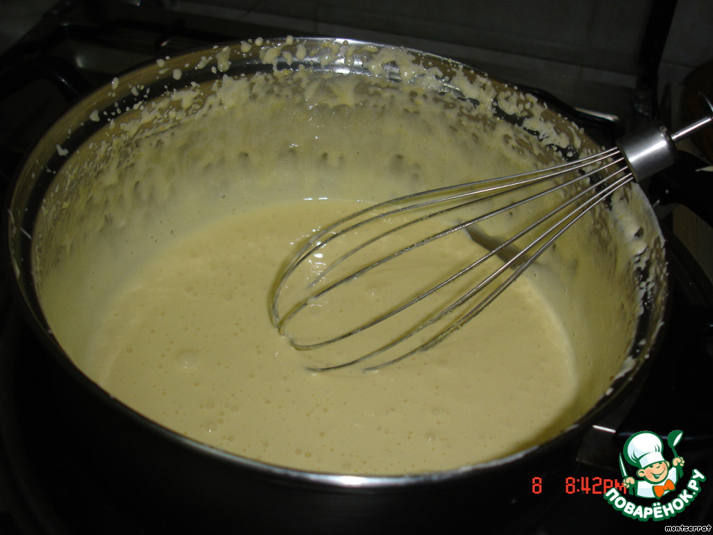 Желатин замачиваем в 4 ложках холодной воды до набухания, потом нагреваем до растворения желатина и соединяем с теплой яичной смесью, хорошо размешиваем.