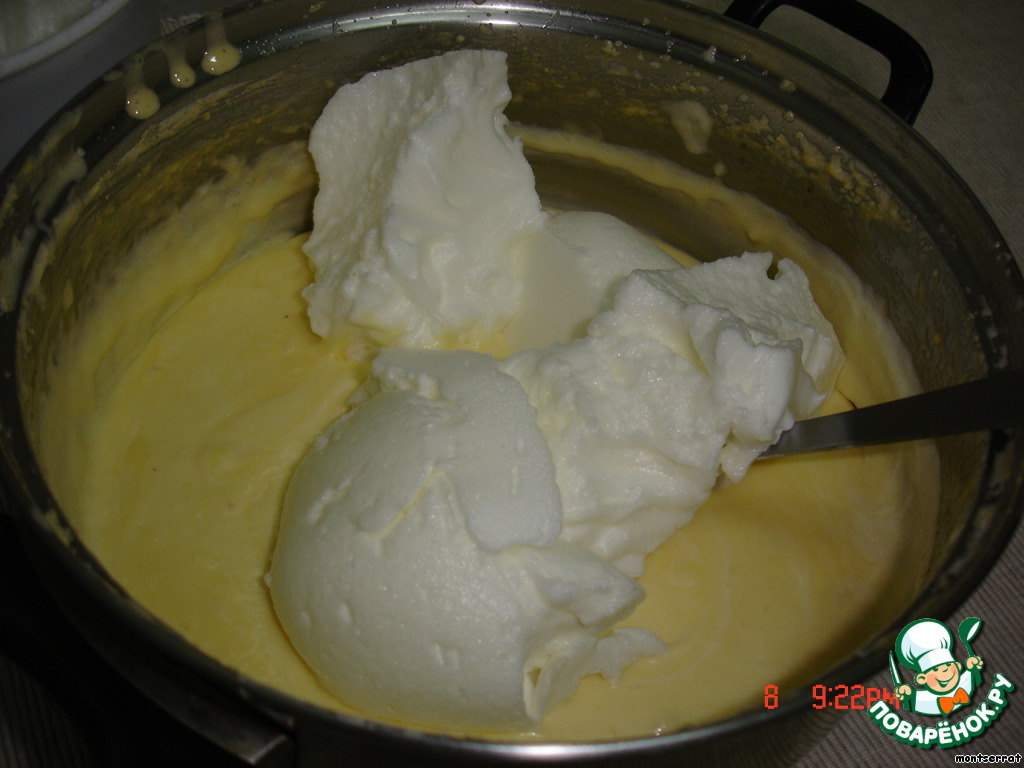 Белки взбиваем до устойчивой пены и осторожно вводим в яично-сливочную смесь,