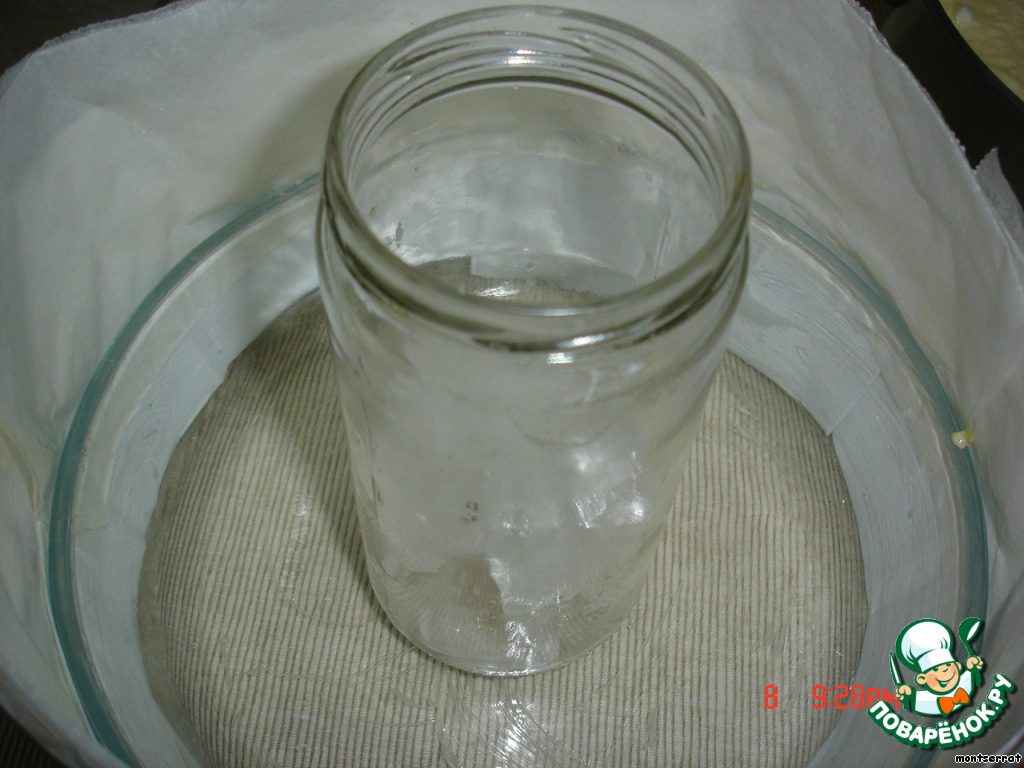 Готовим форму для суфле: стекляную емкость ополаскиваем холодной водой, в центр ставим банку, заполняем ее льдом.