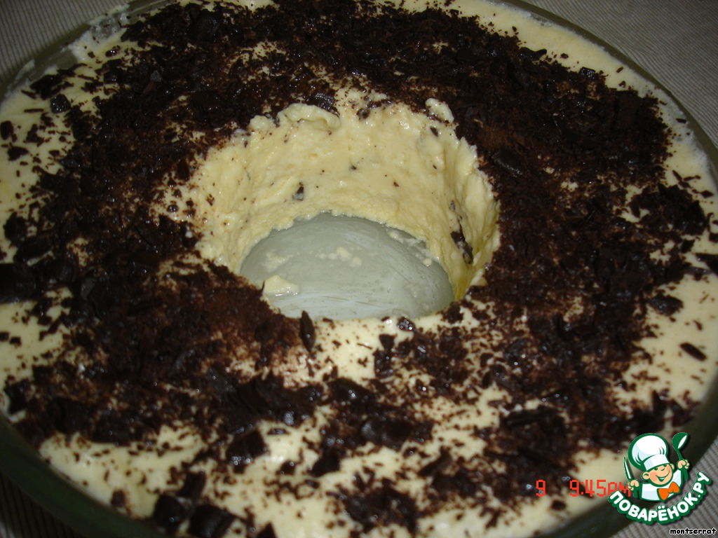 Емкость наполовину заполняем смесью, посыпаем тертым шоколадом, выкладываем оставшуюся смесь, опять посыпаем шоколадом и ставим в холодильник на 4 часа.