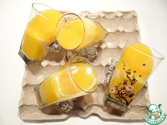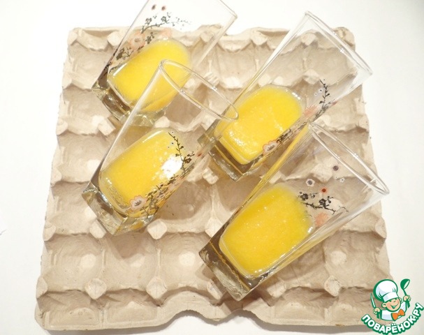 Этот десерт красиво смотрится в квадратных стаканах, я смогла найти стаканы только с квадратным дном, но и в нем десерт смотрелся не хуже. Укладываю стаканы на решетку для яиц так, чтобы жидкость в стакане была наклонена примерно на 45 градусов. Аккуратно вливаю в стаканы персиковое желе. Помещаю решетку в холодильник до полного застывания желе.