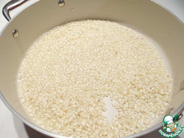 В это время готовлю ризотто. Для его приготовления я использовала рис "Арборио" компании "Мистраль". В сковороде нагреваю оливковое масло, добавляю рис, обжариваю до прозрачности риса.