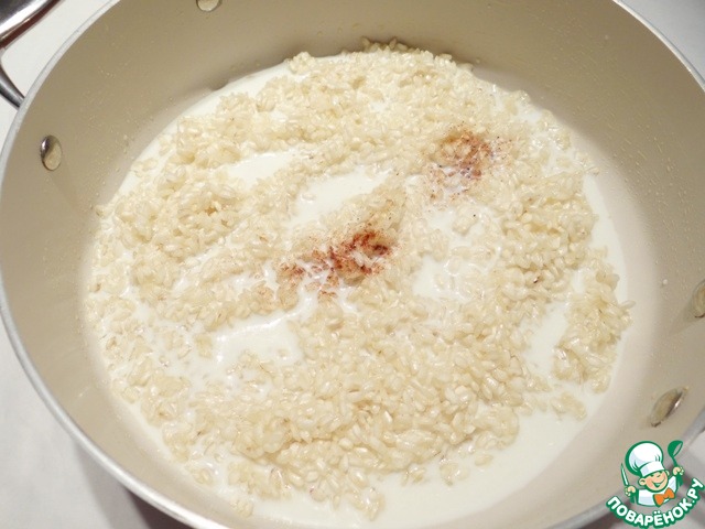 Затем небольшими порциями начинаю добавлять горячее молоко. Рис постоянно помешиваю.