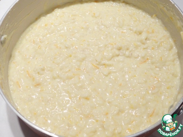Когда рис будет готов (рис в середине должен быть чуть-чуть сыроват), добавляю дольки белого шоколада, цедру апельсина, сахар, ванилин.