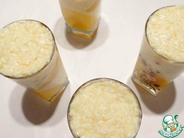 | Предлагаю приготовить необычный десерт из сладкого ризотто с белым шоколадом, цедрой апельсина и желе из консервированных персиков. |