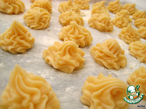 Выстелить противень для выпечки пекарской бумагой, смазать маслом и посыпать мукой. Осадить из кондитерского мешка с насадкой "звезда" небольшие розочки теста, оставляя между ними расстояние.