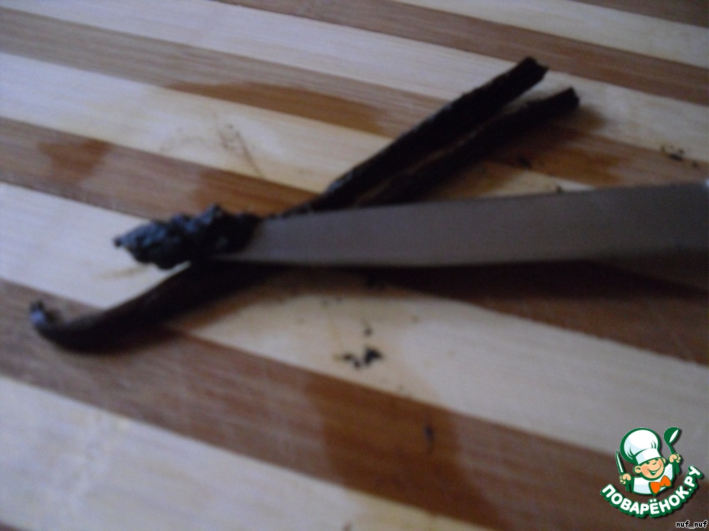 Приготовим заварной крем. Для начала необходимо замочить пластины желатина в холодной воде. Стручок ванили надрезаем вдоль и с помощью ножа выскребаем семена, кладём в молоко вместе со стручком и доводим до кипения. Процеживаем.