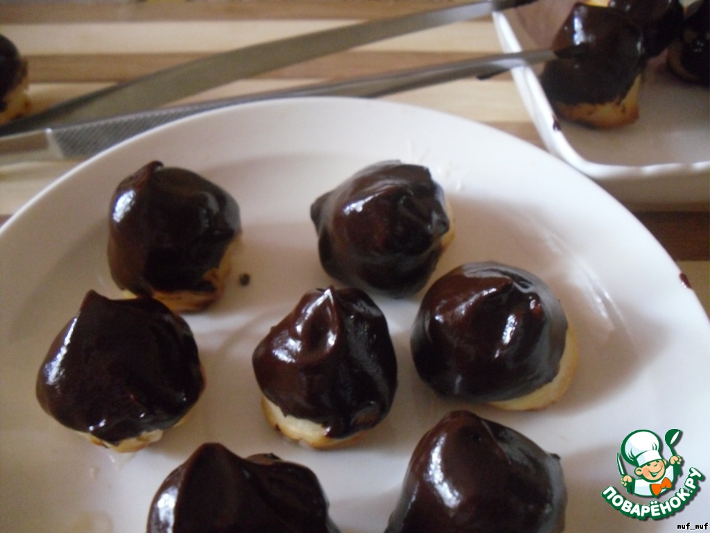Булочки "Шу" начиним заварным кремом. Приготовим глазурь. 50 гр шоколада растопить на водяной бане вместе с 2 ч.л. масла и 1 ст.л. сливок. Тщательно размешаем и окунём наши булочки в глазурь. Я делала это с помощью пинцета.