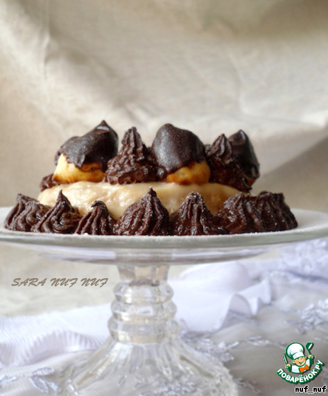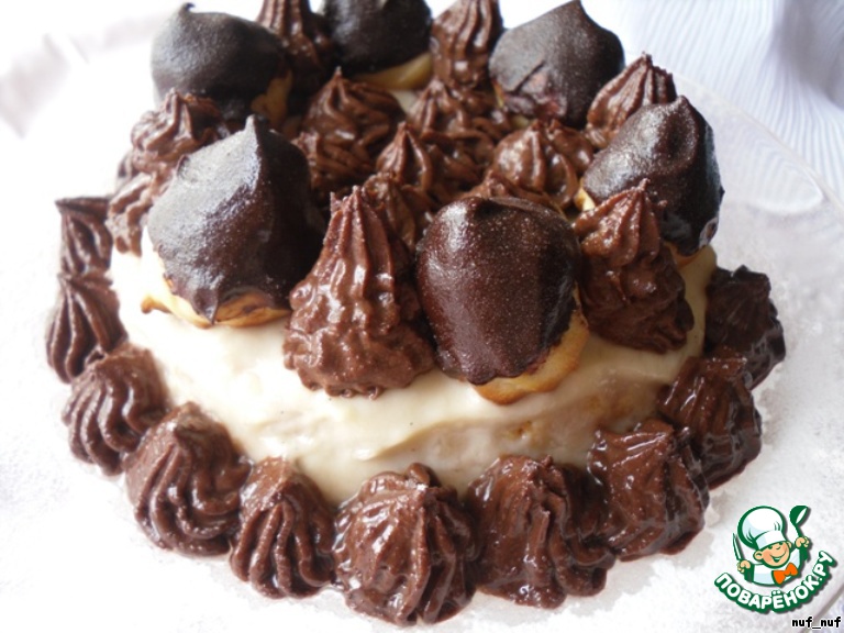 50 гр. шоколада растопить и смешать с половиной заварного крема. Корж из слоёного теста обмазать белым кремом. Отсадить с помощью кондитерского мешка розочки из шоколадного, между ними поместить булочки "Шу" в глазури. Поместить тортик на блюдо, середину и бортики украсить шоколадным кремом. Присыпать сахарной пудрой (по желанию)