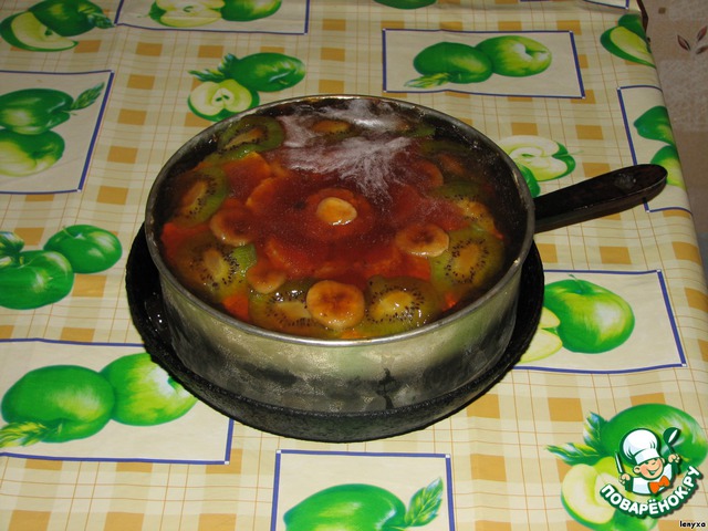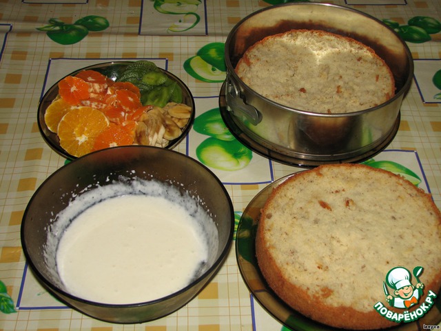 В принципе, фрукты можно брать любые - ананасы, клубнику, яблоки. Количество, если не хватит, можно всегда увеличить - дорезав в процессе "сборки" торта.