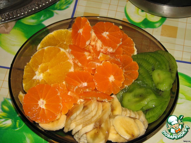 Режем тоненько бананчик (один или два - у меня был один), очищеноое киви (одно или два - у меня одно) ,очищенный апельсин режем кружочками, и очищеные мандарины тоже кружочками (у меня три маленьких).