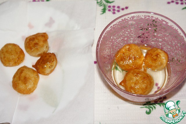 Шарики выкладываем на бумажные салфетки на 2-3 минуты, затем горячими немедленно опускаем их в холодный сахарный сироп на 1-2 минуты. Шарики должны быть покрыты сиропом полностью.
