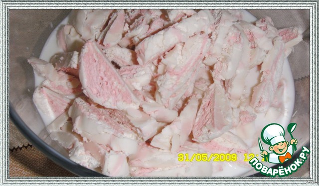 (Слова автора-Юли).Обычно крем делают из зефира и сливок, сметаны или йогурта, но я использовала молоко 0,5 % Крем в связи с этим получается очень жидким и промазывать бисквит конфитюром обязательно, иначе бисквит впитает в себя крем( Пропитывать бисквит можно соком или сиропом (вода, сахар, лимонный сок).