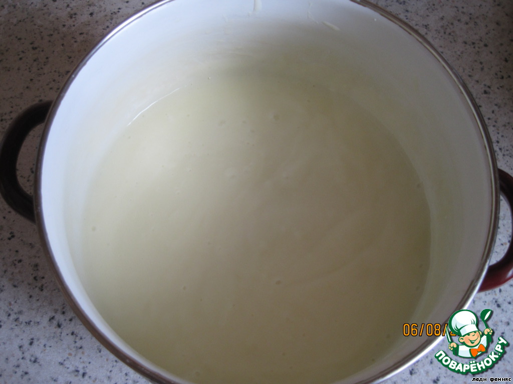 Для крема: смешать молоко, желтки, сахар, крахмал и 1,5 ст.л. муки. Ставим на огонь и, постоянно (!) помешивая, варим до загустения. Затем снять с огня, немного остудить и взбить с маслом.