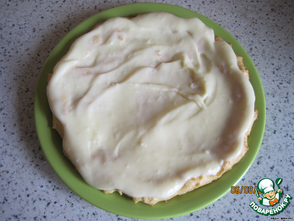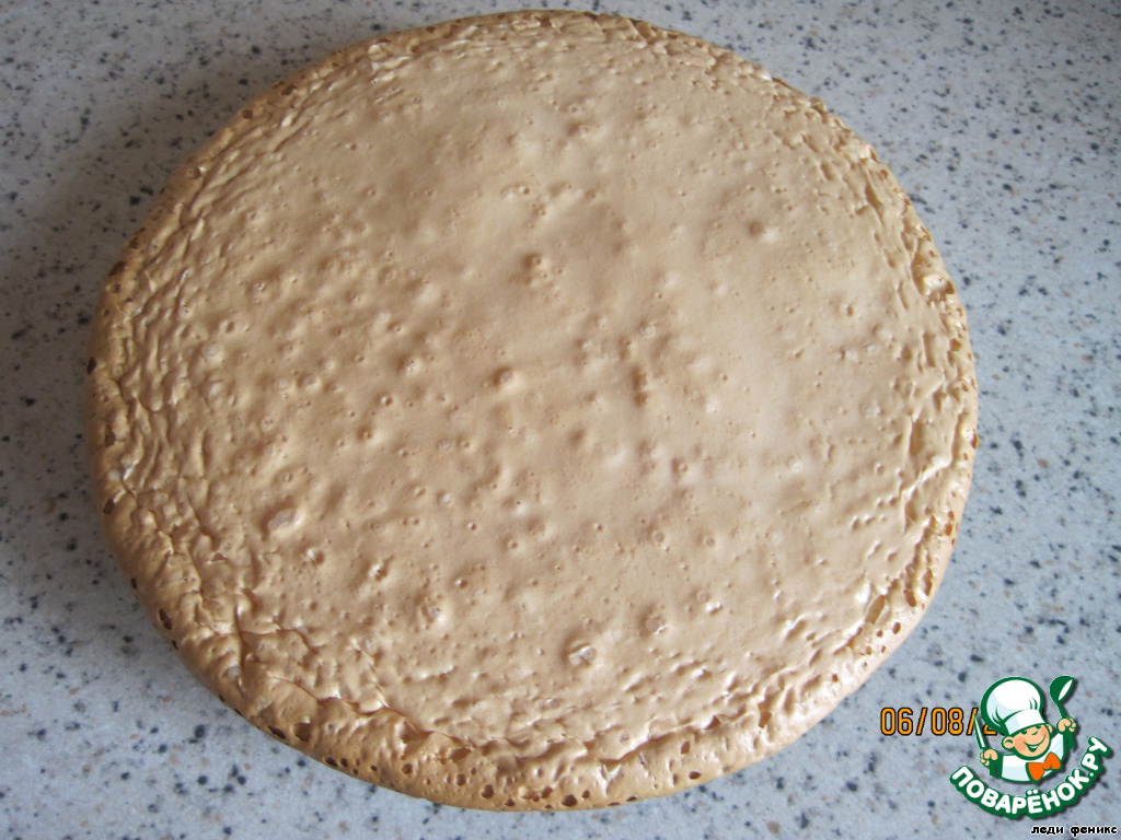 Теперь собираем торт: заварной корж, крем, безе, крем, заварной корж и крем.
