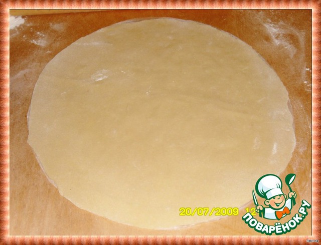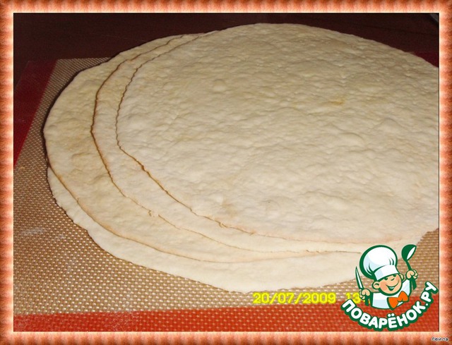 Раскатать тонкие коржи(на одной пергам.бумаге,смазать каждый раз маслом,выпекла все коржи), наколоть их вилкой в нескольких местах (чтобы не вздувались),