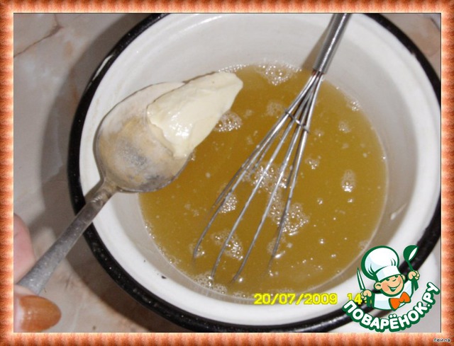 [b]Коржи. [/b]50 г сл.масла,3 ст.л. мёда,2/3 ст. коричневого сахара,1 яйцо,1/4 ст. молока,1/2 ч.л. соды,3 ст. муки,щепотка соли
