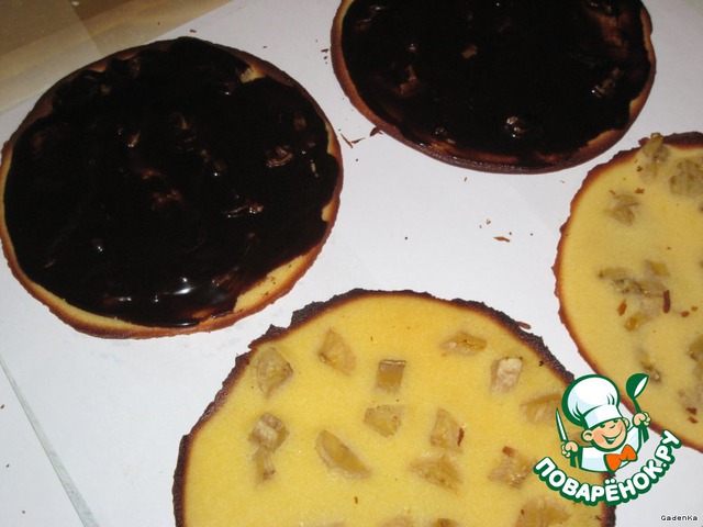 Затем поверх шоколада намазать крем на одну лепешку, положить вторую, смазать кремом и т. д., обычная сборка тортика.