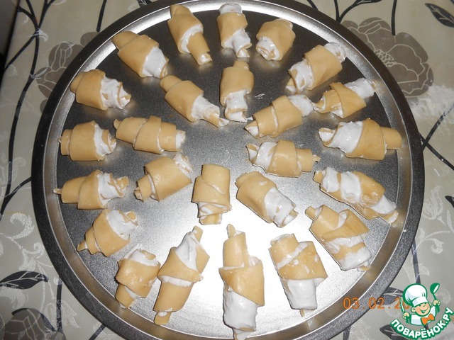 Нарезаем раскатанное тесто на треугольнички и скручиваем их
