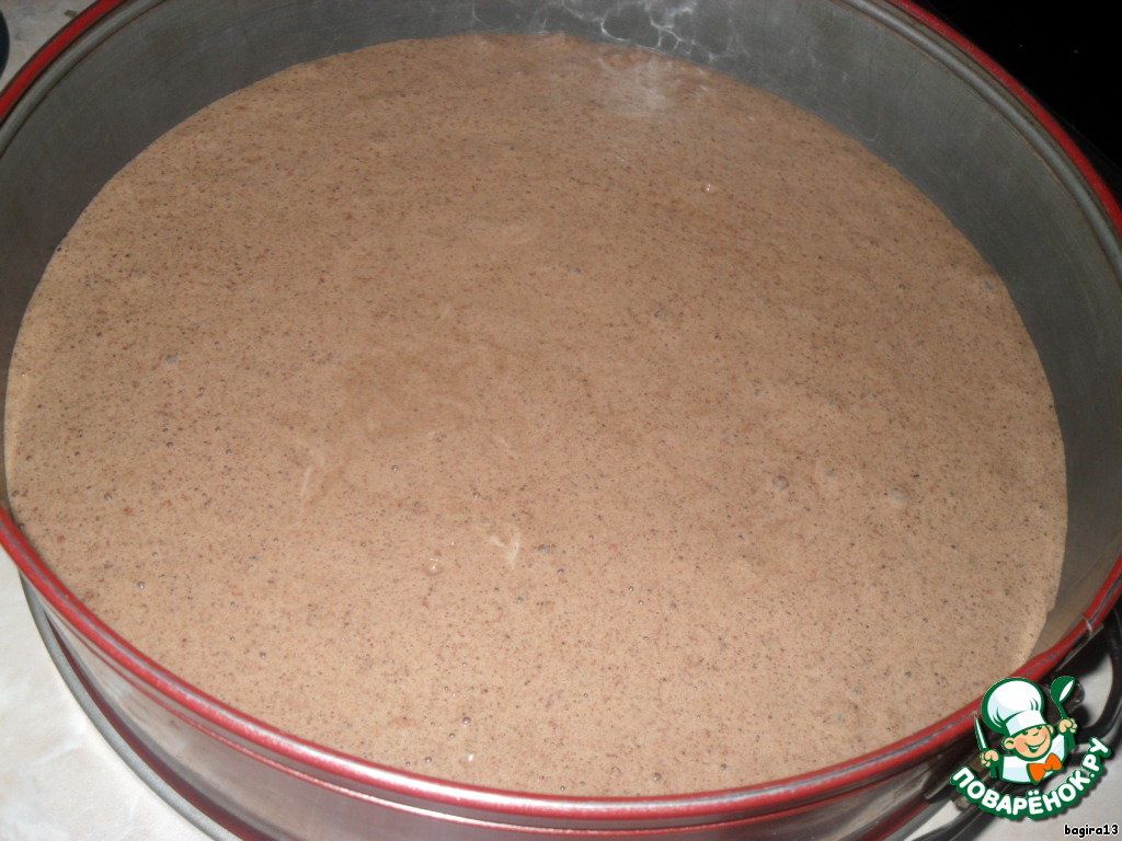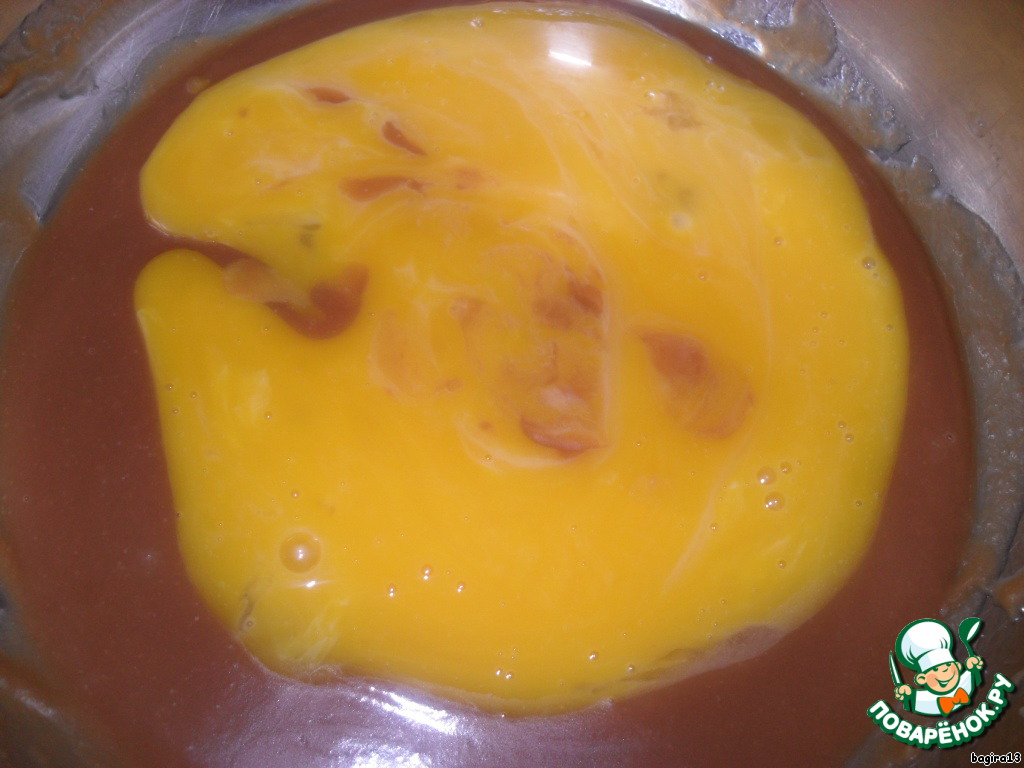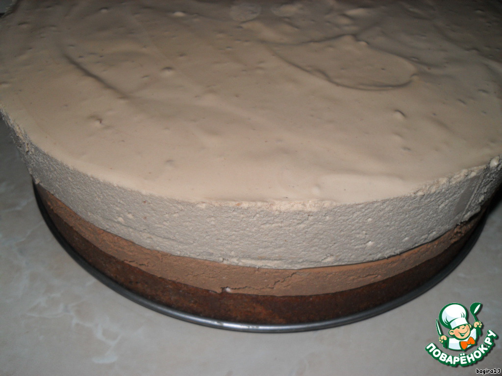 Для приготовления бисквита арахис измельчить, смешать с мукой и какао. 3 яйца взбивать с 30 г сахара в течение 10 минут. Сухую смесь добавить в яйца, хорошо перемешать.
