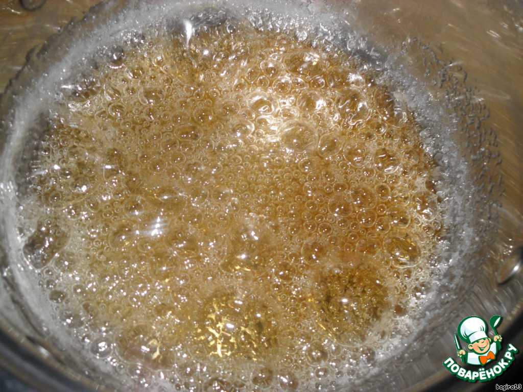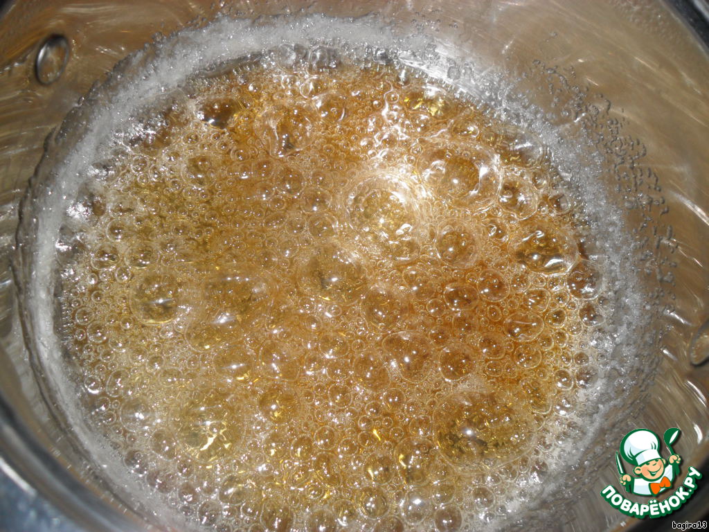 Из 40 мл воды и 3 ст.л. сахара сварить карамель до получения золотистого цвета. Нагреть до кипения 150 мл сливок и аккуратно ввести в карамель. Масса при этом будет сильно пузыриться и булькать, поэтому сливки нужно добавлять тонкой струйкой.