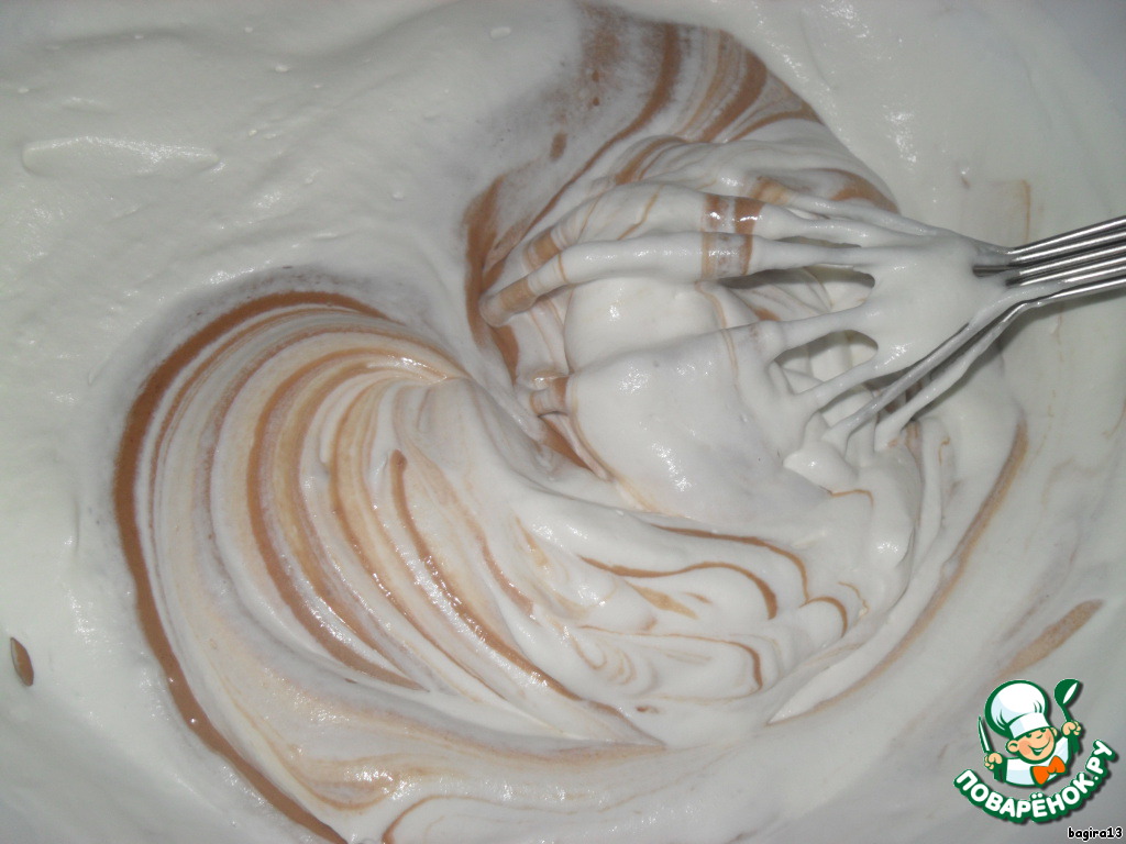 4 белка взбить с 100 г сахара до пиков и в несколько приемов ввести в тесто. В последнюю очередь добавить 30 г растопленного сливочного масла.