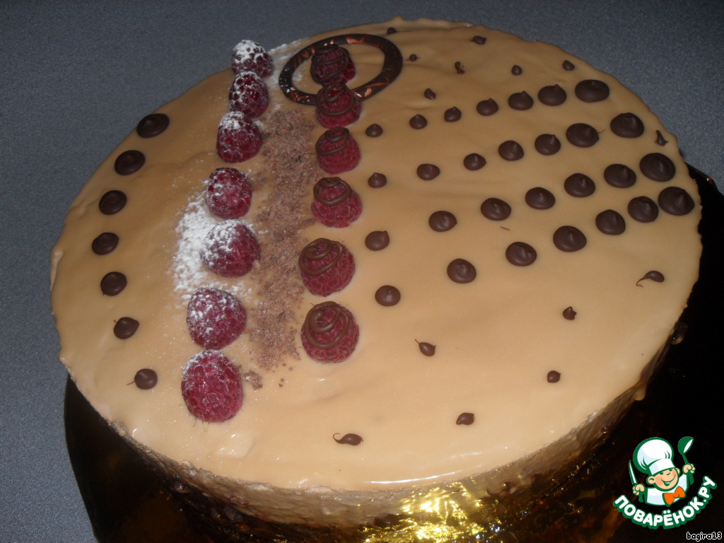 Глазурь: 2 ст.л.сахара уварить до получения золотистого цвета, затем добавить 100 мл горячих сливок, хорошенько размешать до получения однородной массы. Затем добавить 4 г желатина, слегка остудить и залить верх торта. Вместо карамельной глазури можно использовать ганаш (100 г черного шоколада растопить, залить 100 мл горячих сливок и размешать до получения однородной массы).