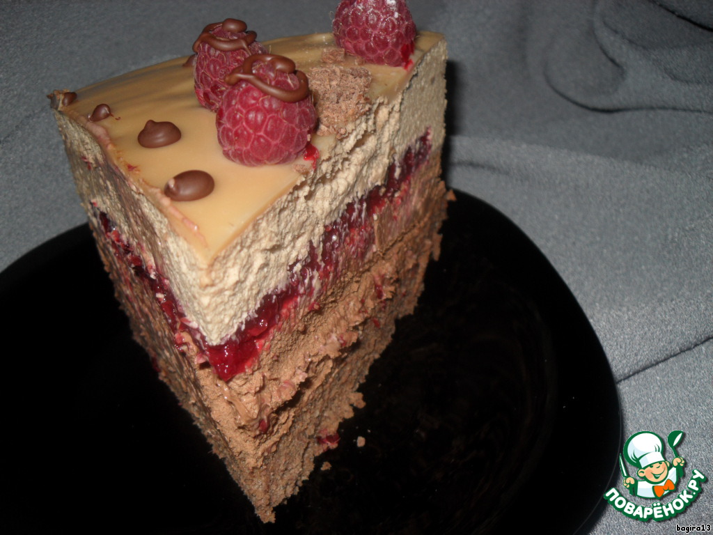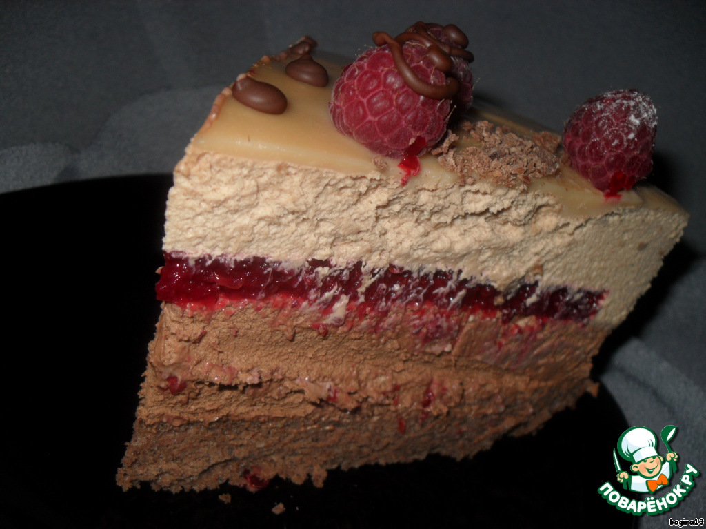На дно разъемной формы положить бисквит, пропитать его малиновым сиропом или соком с добавлением коньяка по вкусу. На бисквит выложить шоколадный мусс и убрать в холодильник для застывания.
