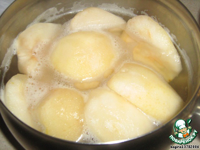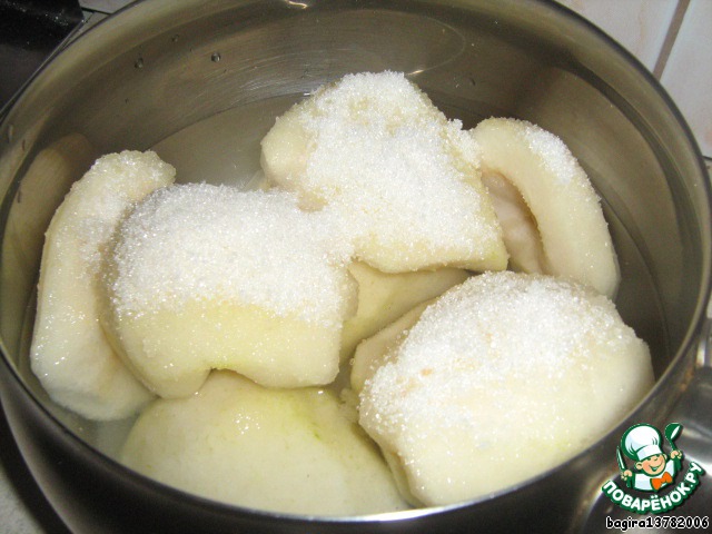 Затем засыпаем груши сахаром, заливаем водой и ставим на огонь на 15 минут.