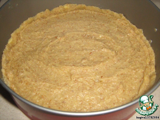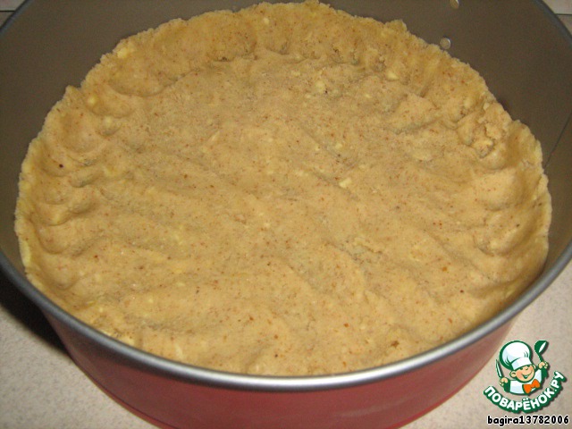 Распределяем тесто по форме (у меня форма 26 см) и убираем в холодильник на 30 минут.