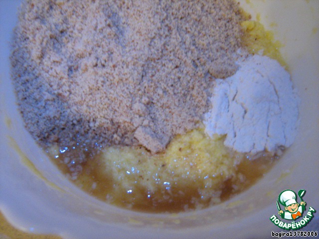 добавляем муку, измельченный миндаль и ром (я брала коньяк).