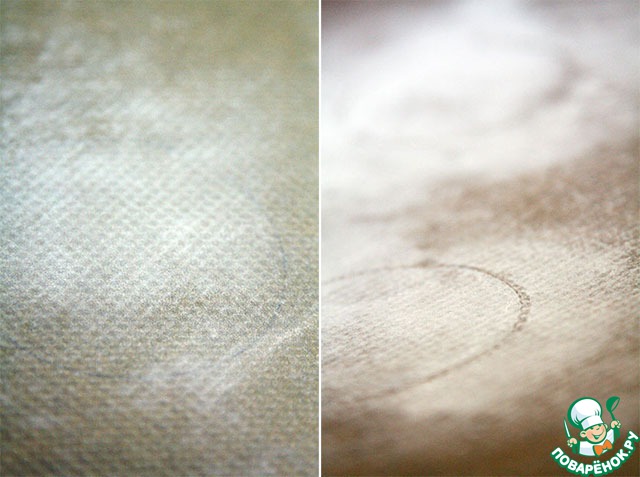 1 - рисуем на бумаге круги с помощью стакана диаметром около 7-8см, после чего переворачиваем лист и присыпаем крахмалом. Но как видно из левого фото, у меня ручка стала практически невидна)) Так что или воспользуйтесь маркером, или идите по втором пути