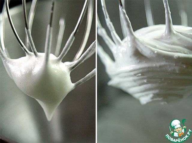 Теперь приготовим меренгу. Яйца помыть, отделить белки от желтков, белки перелить в чистую, СУХУЮ емкость и взбить до крепких пиков. Продолжая взбивать, добавляем по ложке весь оставшийся сахар, пока у нас не получится плотная меренга. Следом добавим крахмальную смесь, ваниль (можете использовать также ванилин) и уксус, еще раз взобьем.