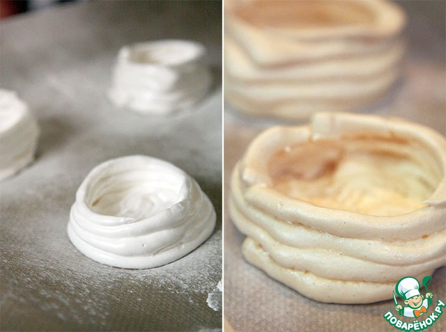 Сначала мы заполняем круг, далее аккуратно строим борта. Учиться мне еще и учиться, как Вы можете заметить))) Но главное - колодцы получились! Пусть и не очень ровные)) Отправляем противень в духовку на 40-45 минут (если на середине времени безе начнут сильно коричневеть, убавьте огонь градусов на 10-20), далее духовку выключаем и даем пирожным остыть, не вынимая.