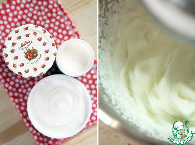 А пока они готовились, мы сделали наполнитель в виде творожного крема. Для этого необходимо было хорошо взбить йогурт с творогом, добавить клюквенный соус, перемешать и убрать в холодильник.