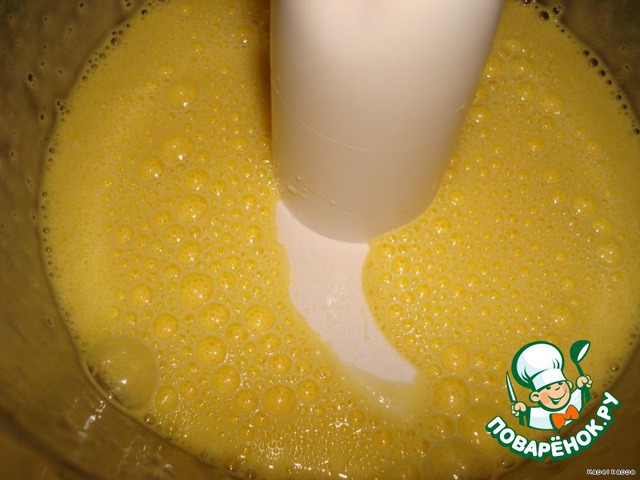 Яйца взбить с сахаром, добавить молоко(только молоко не должно быть холодным), муку с разрыхлителем