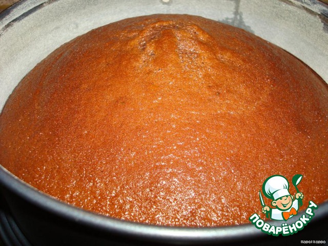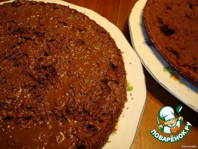 разрезать на два коржа и ещё тёплый нижний корж смазать шоколадной