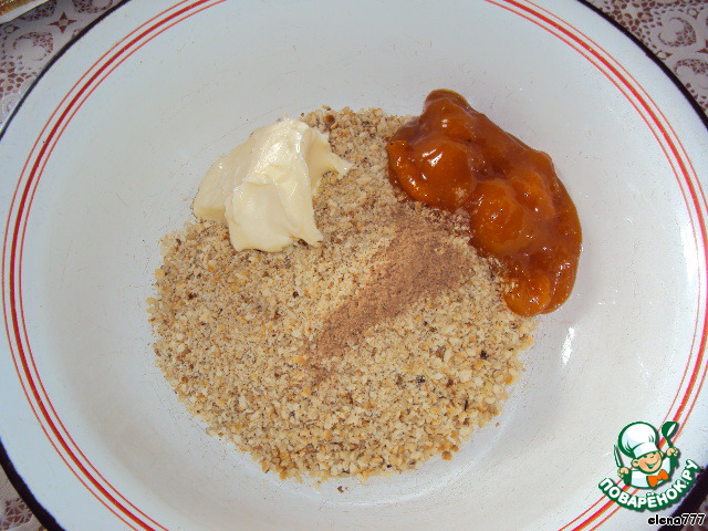 В эту массу добавить варенье, размягчённое сливочное масло, чуть ванили и корицы (по желанию). Варенье я взяла абрикосовое, но можно любое, какое вам нравится.