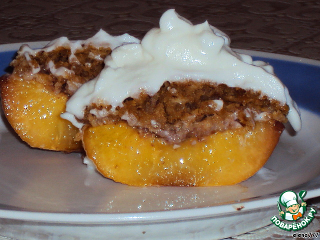 Этой массой начинить половинки персиков. Можно даже сразу кушать без крема, уже очень вкусно!