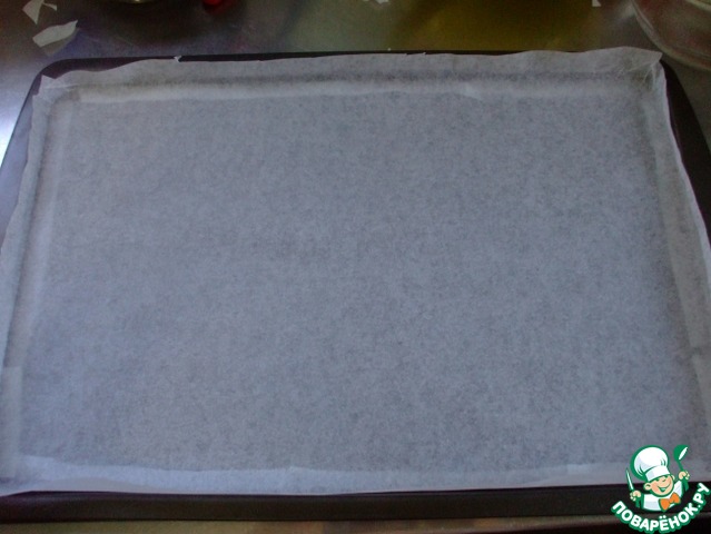 Итак, противень застелить пекарской бумагой. Сделать бортики, тесто должно распределяться ровно и равномерно). Духовку разогреть до 180С.