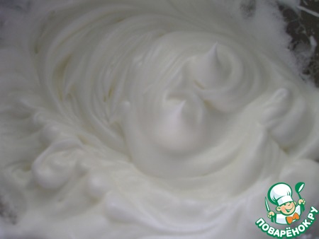 Делаем меренгу. Взбить 60 гр белка до мягких пиков и до того, когда уже не останется жидкого белка на дне. В три приема ввести 15 гр мелкого сахара, не прекращая взбивать. Этим мы осаживаем белок и укрепляем массу. Я никогда не беру белок из холодильника. Наоборот, довожу его до комнатной температуры. Перед работой с белком протираю миску, нож, которым разбиваю яйца, лопасти миксера салфеткой, смоченной уксусом, убирая все возможные следы загрязнений или жира. Начинаю взбивать на низких оборотах, заканчиваю на средних. На больших оборотах есть риск перевзбить белок, сделать его ватным. Белок блестит, из миски не выпадает при опрокидывании миски – меренга готова. Накрываем миску пищевой пленкой и отставляем в холодильник.