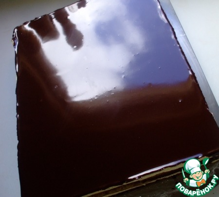 Бисквит Джоконда: Для теста: Яйцо куриное 150 гр, Пудра сахарная 113 гр, Мука миндальная 37,5 (38 гр), Мука пшеничная 30 гр, Белок яичный комнатной температуры 60 гр, Сахар песок мелкий 15 гр, масло сливочное 20 гр. Прежде всего нужно подготовить противень. Это количество теста должно хватить ровно на противень 33х40. Если противень меньше - бисквит получится толще, а это неправильно. Если у вас нет противня нужного размера, просто равномерно распределите тесто по имеющемуся у вас противню, толщиной не более 0,5 мм. Равномерность проверьте деревянной палочкой, погрузив (ткнув!)) ее в разные части распределенного по противню теста. В дальнейшем у вас должен получиться торт 24 на 14 см, толщиной не более 3,5 см, который после обрезания и выравнивания краев станет размером 22 (23) на 12 (13) см. Если хотите торт большего размера – выпекайте 2 (3) бисквита (соответственно увеличив пропорции) и обрезайте их до нужного размера. Я выпекала двойную порцию на торт 20,5 на 24,5 см. Бисквит посредине у меня получился сборный. Выпекала в двух противнях, тесто для бисквита готовила два раза. Т. е в общей сложности мне понадобилось: 300 гр яйца, 225 гр сахарной пудры, 75 гр миндальной муки, 60 гр муки, 120 гр белка, 30 гр сахара, 40 гр сливочного масла. Можно было сделать сразу эту порцию теста и распределить ее на двух противнях. За это короткое время выпекания (8-11 минут), ничего бы не случилось.