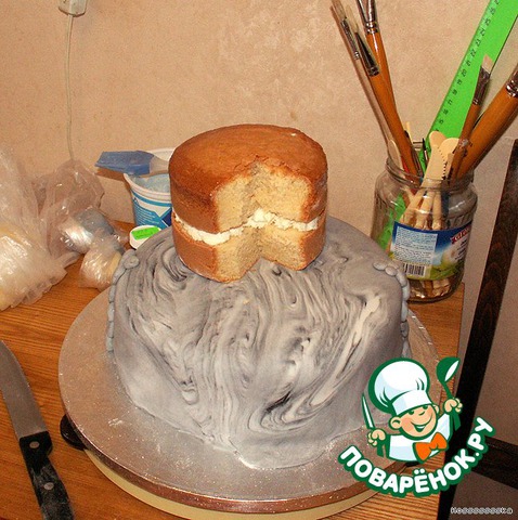Три коржа в основание горы подравниваем, нижний приклеиваем сгущенкой к подставке.